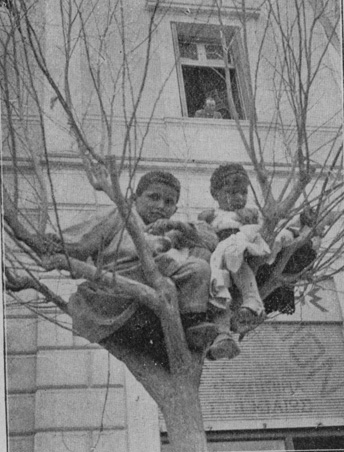 Gator och torg voro proppfulla af åskådare, som lifligt, applåderade de mest lyckade tågen. På ett ställe upptäckte vi högt uppe i ett träd ett par små